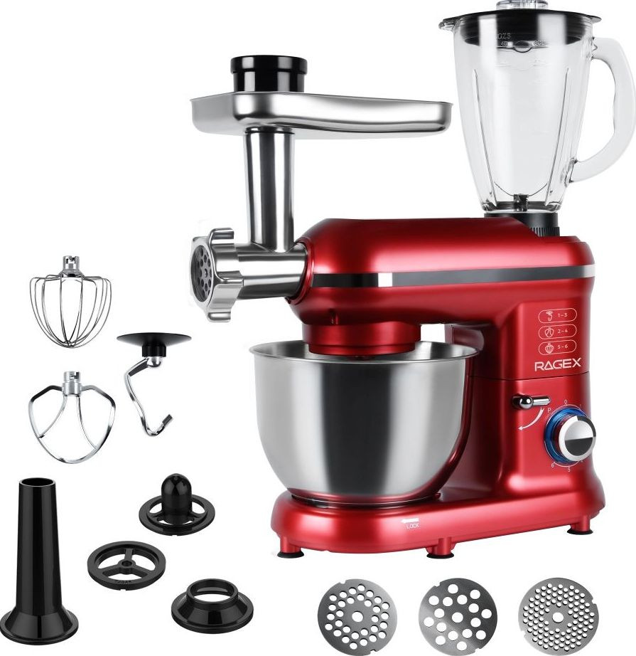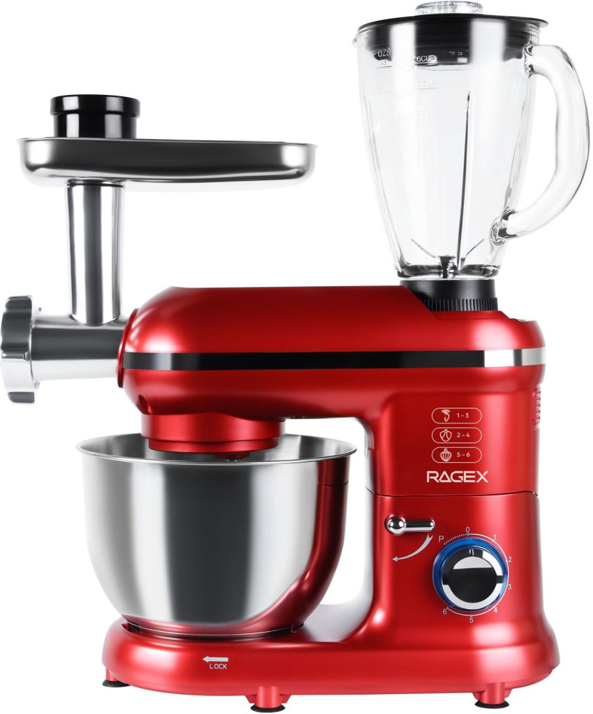 Кухонный комбайн RAGEX R101 (красный) — многофункциональное устройство, которое станет верным помощником на любой кухне. Модель совмещает в себе функции блендера, планетарного миксера, мясорубки и овощерезки (докупается отдельно). Импульсный режим подходит для измельчения твердых продуктов: орехов, круп, специй и льда.
