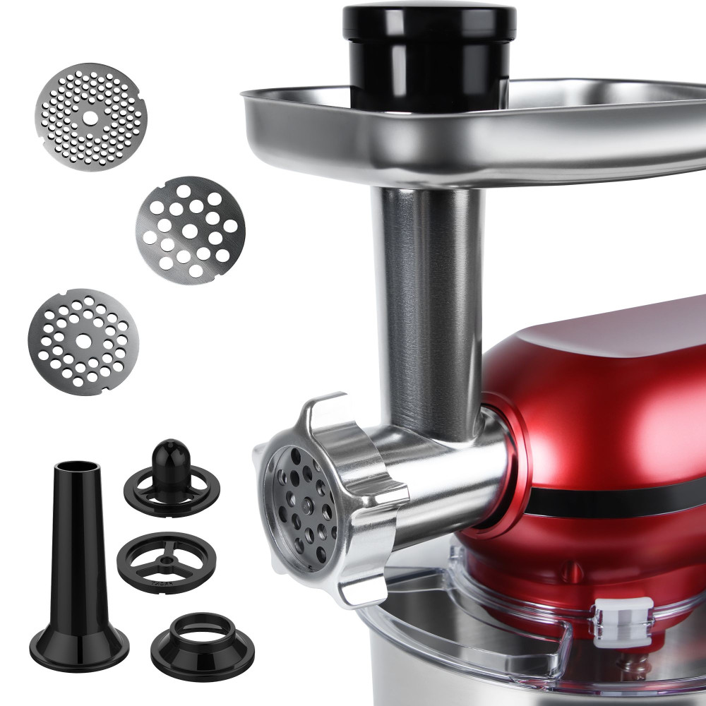 В комплекте: кухонный комбайн, чаша металлическая, защитная крышка от брызг, крюк для теста, плоский битер (венчик для перемешивания), венчик для взбивания, блендер, мясорубка (корпус мясорубки, толкатель, лоток, шнек, нож, гайка зажимная, решетки с отверстиями, насадка для сосисок, насадка для колбасок «кеббе», разделитель для колбасок «кеббе»), руководство пользователя.