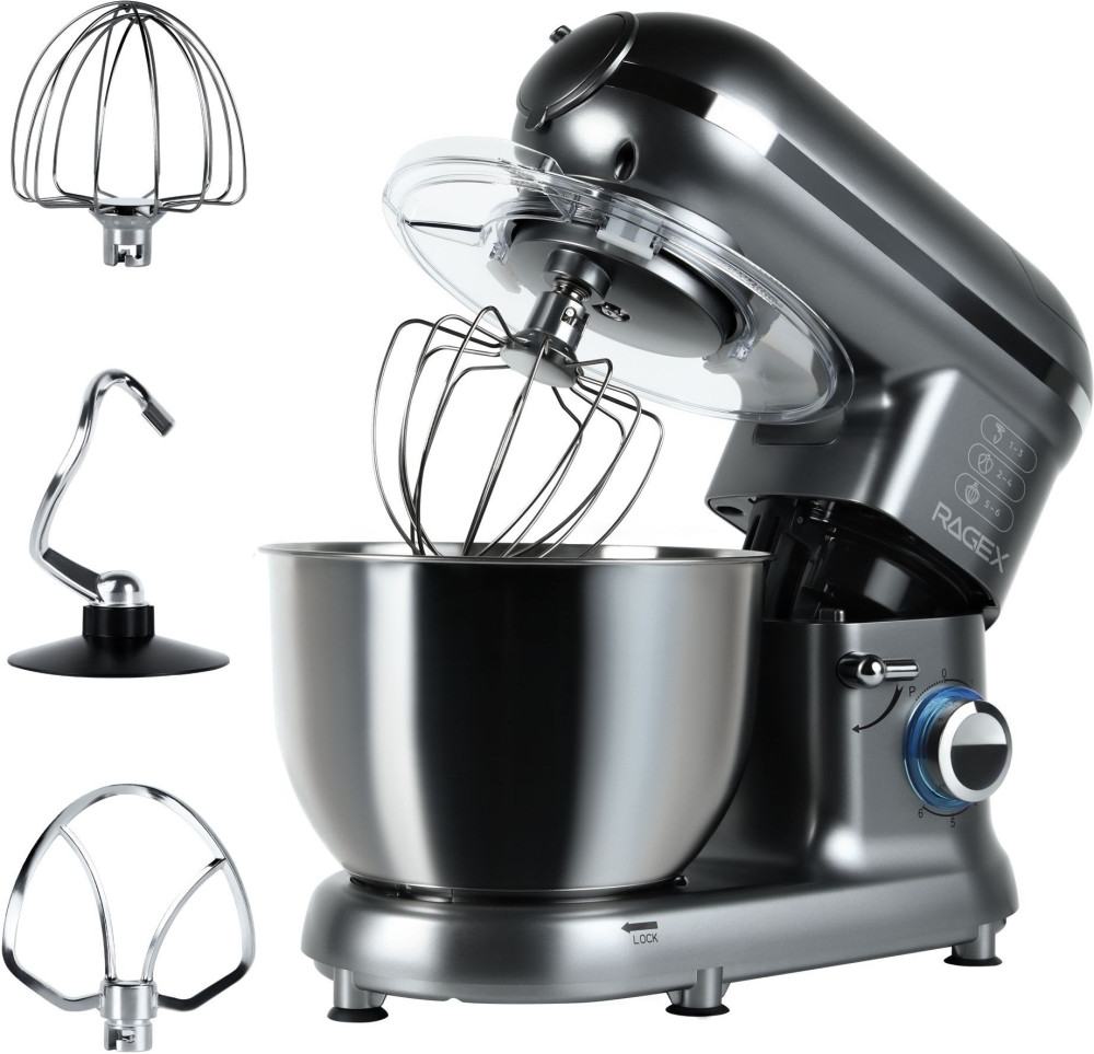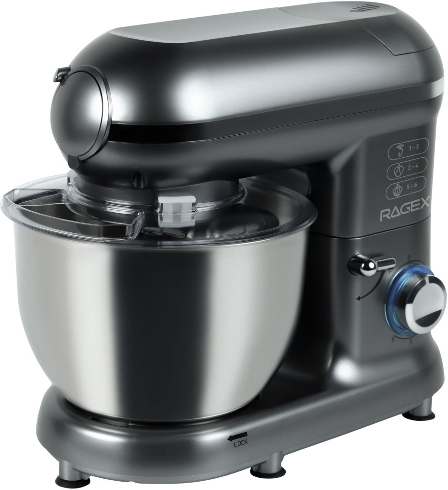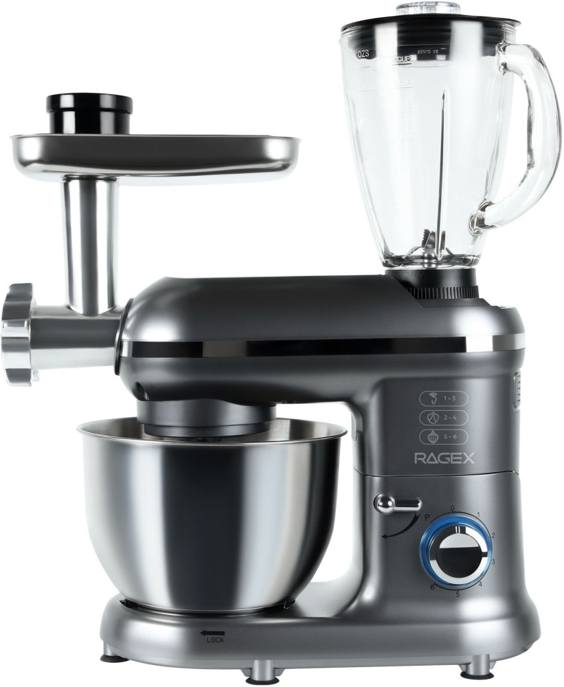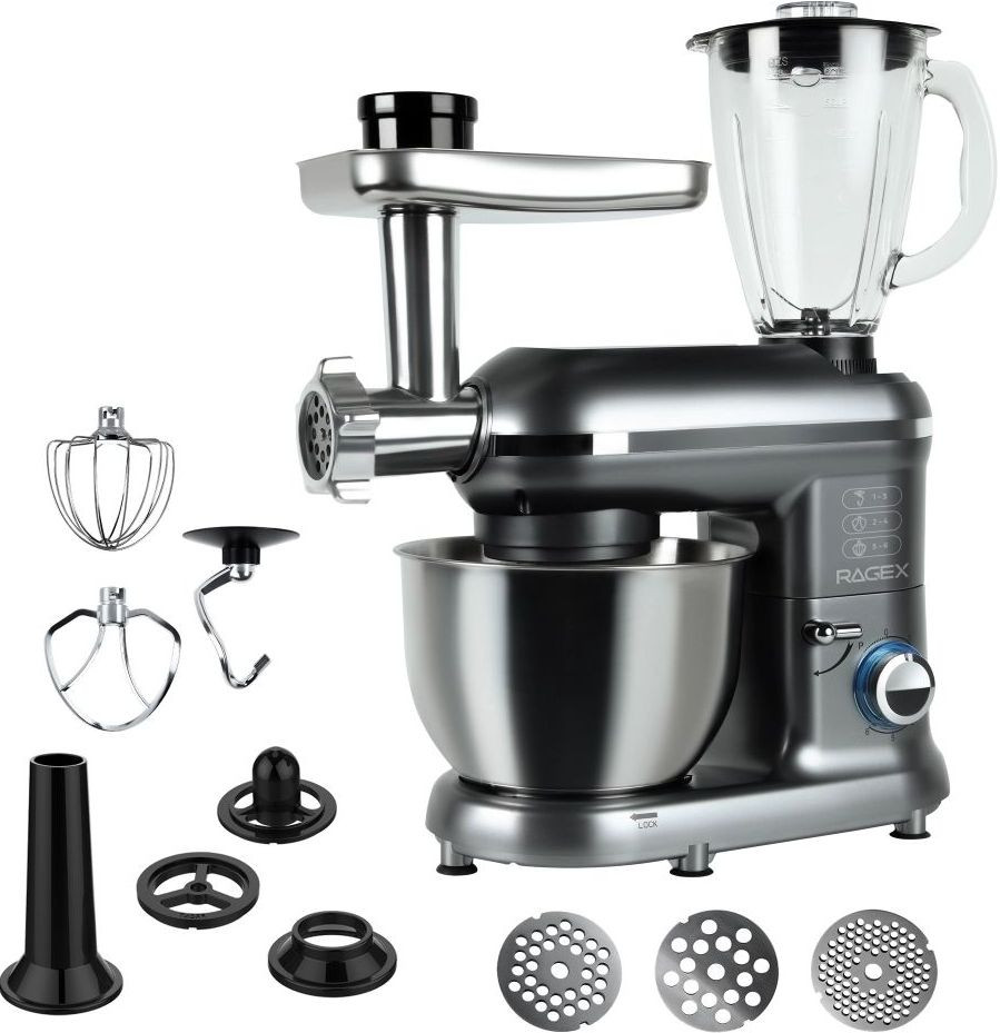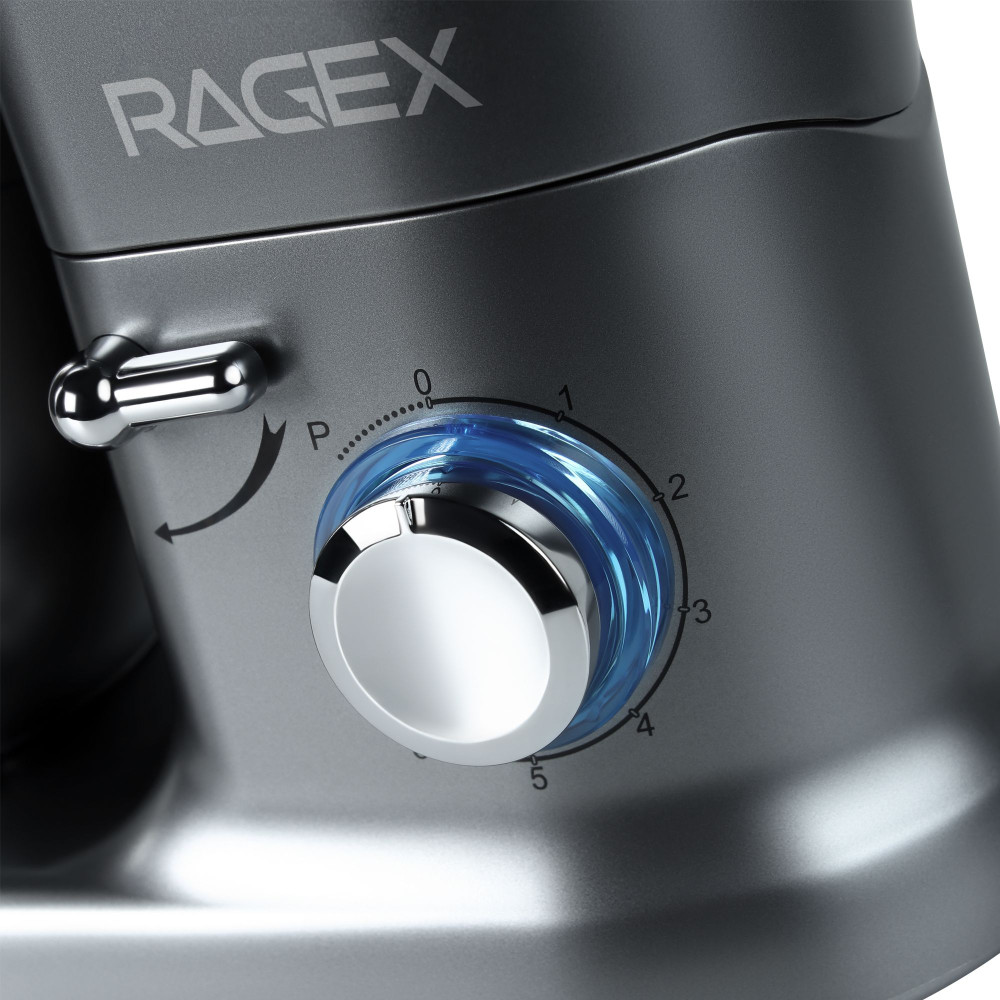 Кухонный комбайн RAGEX R101 (серый) — многофункциональное устройство, которое станет верным помощником на любой кухне. Модель совмещает в себе функции блендера, планетарного миксера, мясорубки и овощерезки (докупается отдельно). Импульсный режим подходит для измельчения твердых продуктов: орехов, круп, специй и льда.
