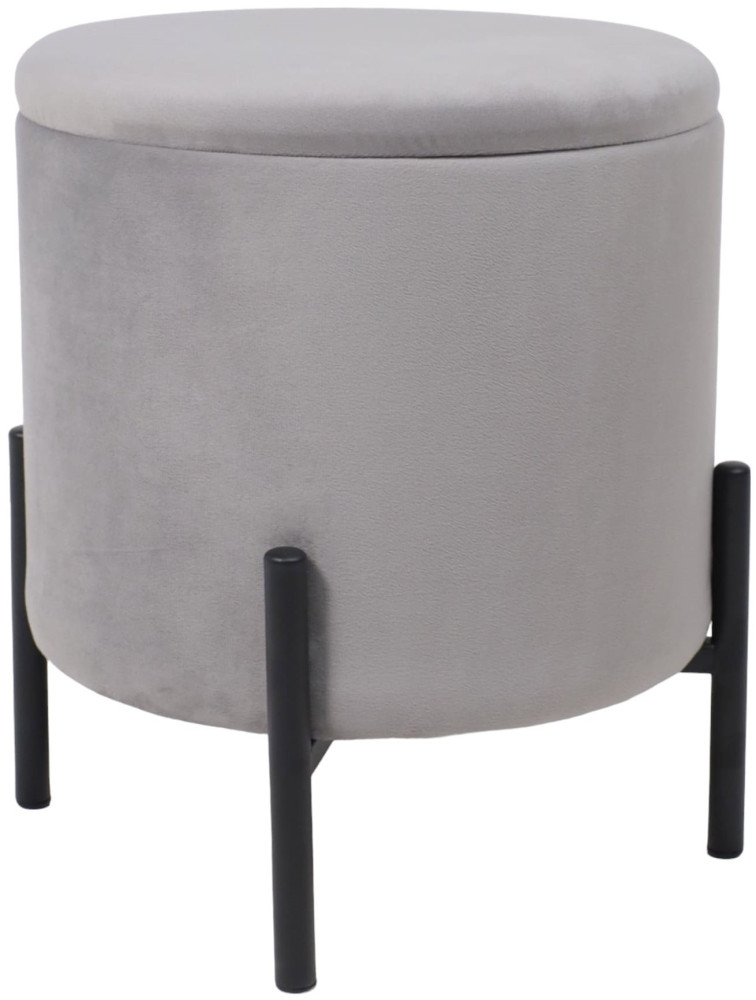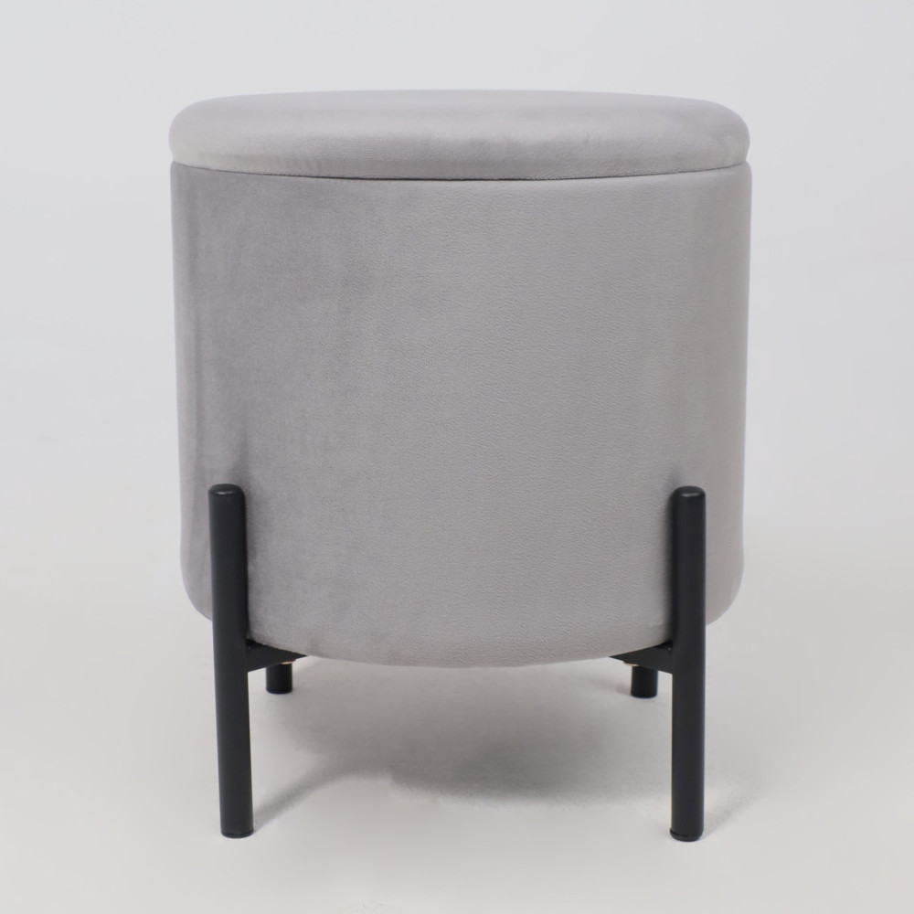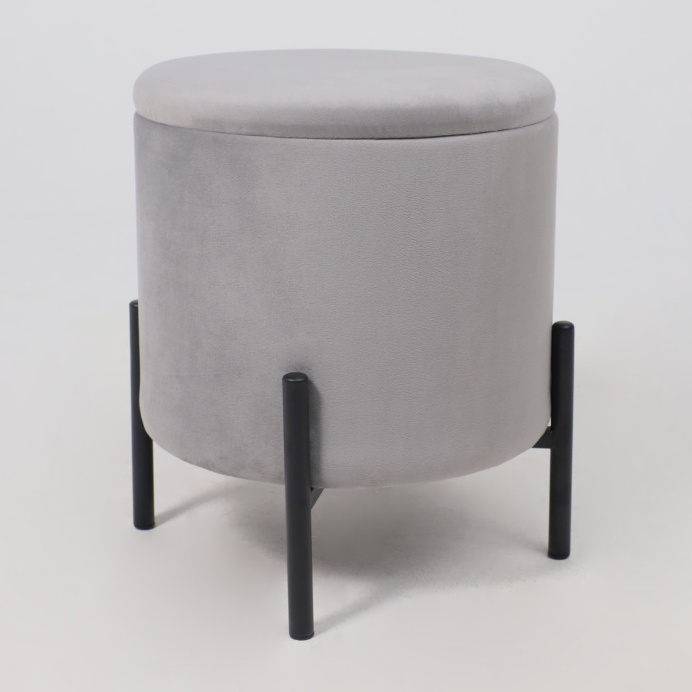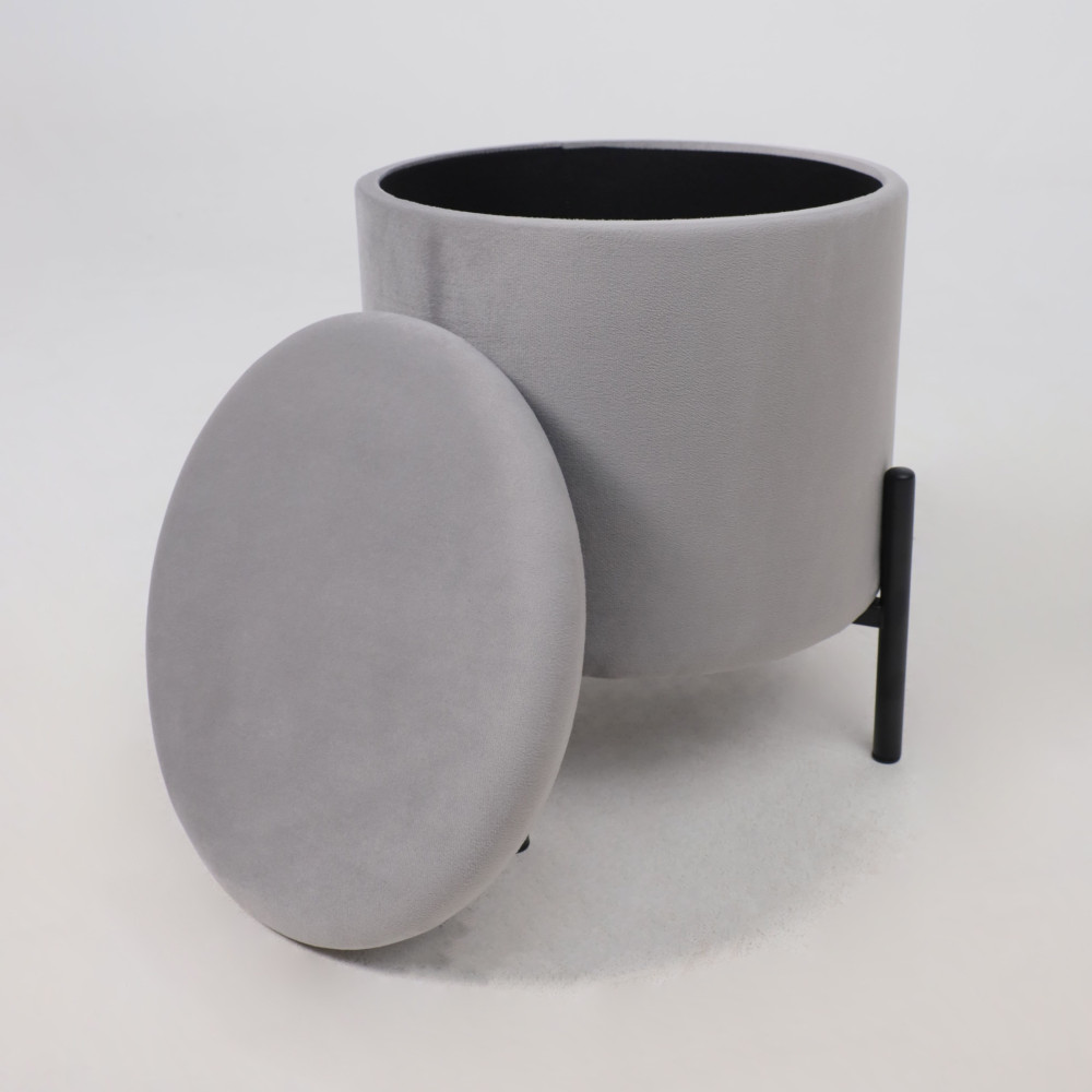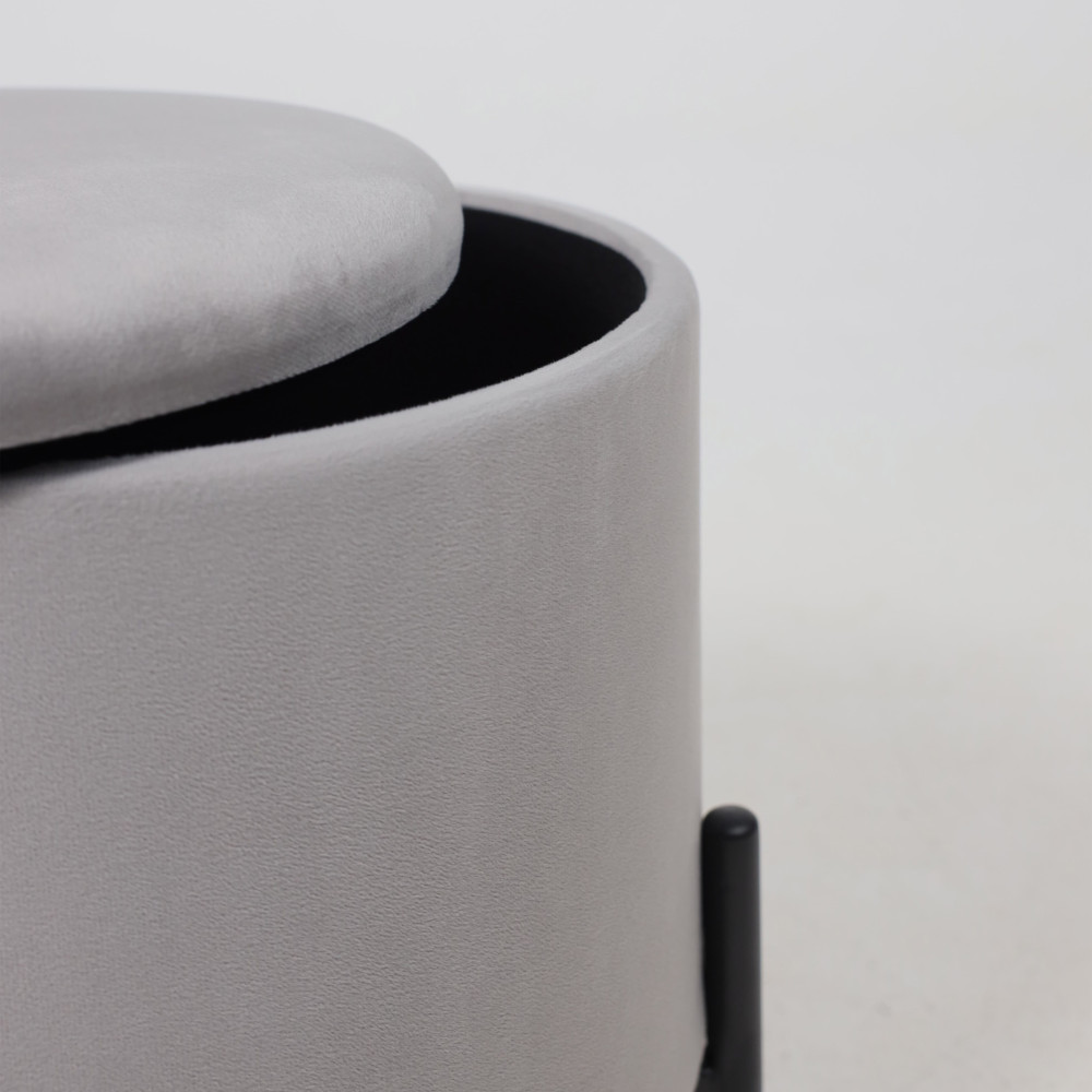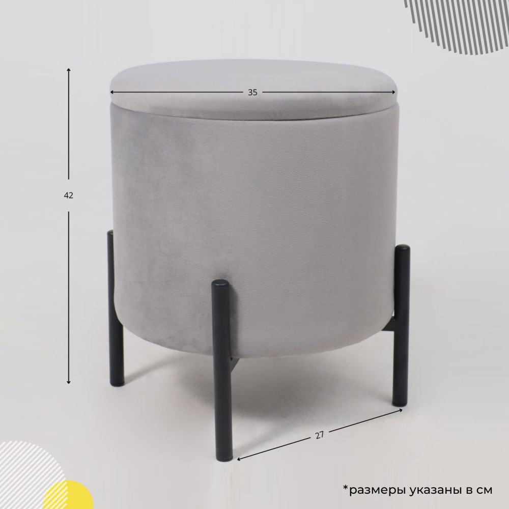 Пуф имеет стильную круглую форму, которая гармонично вписывается в любой интерьер. Обивка выполнена из мягкого велюра, придающего изделию роскошный и презентабельный вид. Материал обивки приятен на ощупь и обеспечивает комфорт при использовании. Он оснащён вместительной нишей под откидной крышкой, что позволяет использовать его для хранения бытовых вещей и различных мелочей.