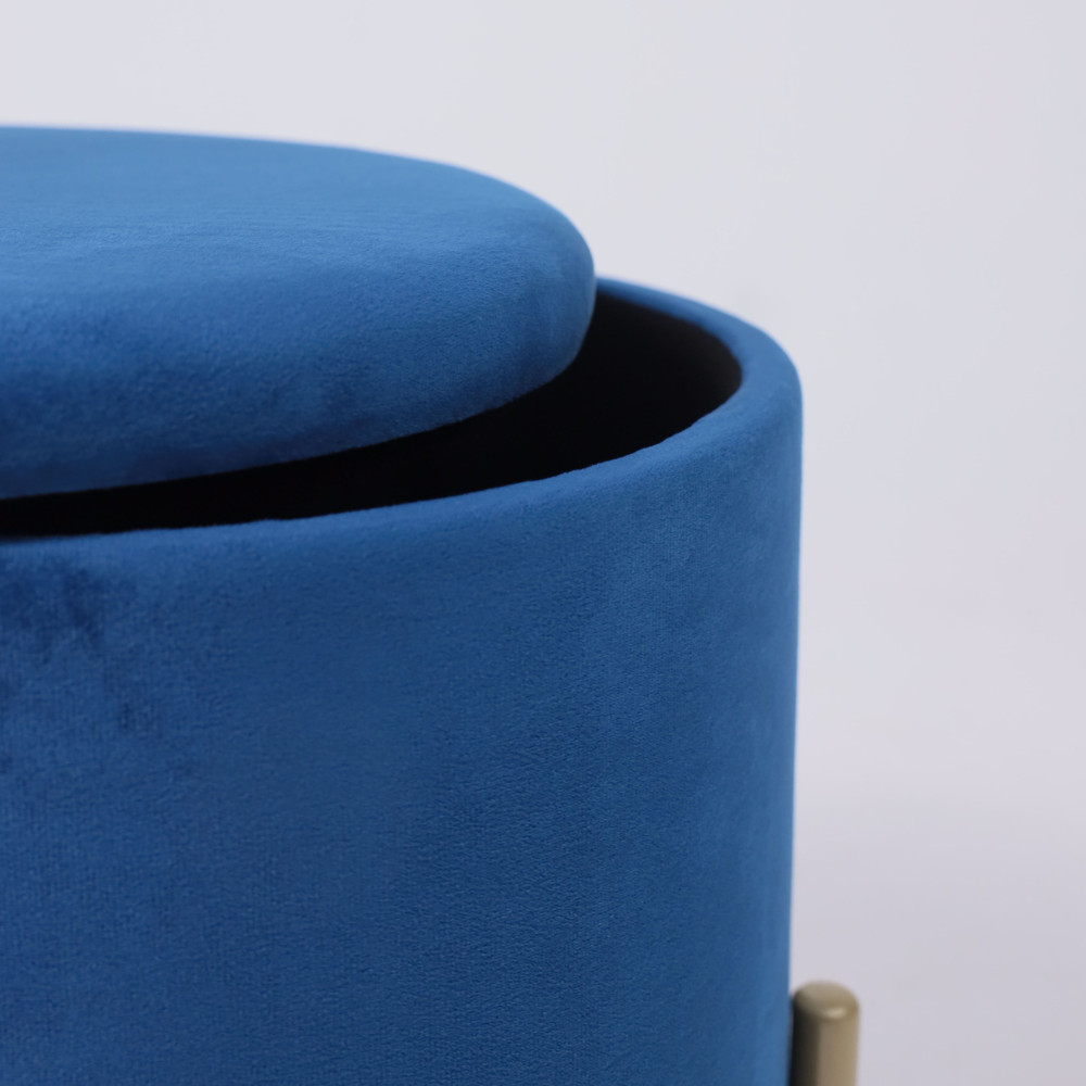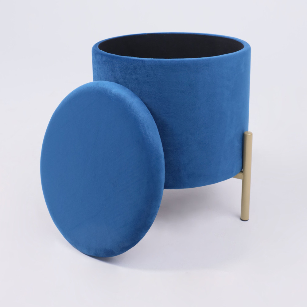 Пуф имеет стильную круглую форму, которая гармонично вписывается в любой интерьер. Обивка выполнена из мягкого велюра, придающего изделию роскошный и презентабельный вид. Материал обивки приятен на ощупь и обеспечивает комфорт при использовании. Он оснащён вместительной нишей под откидной крышкой, что позволяет использовать его для хранения бытовых вещей и различных мелочей.